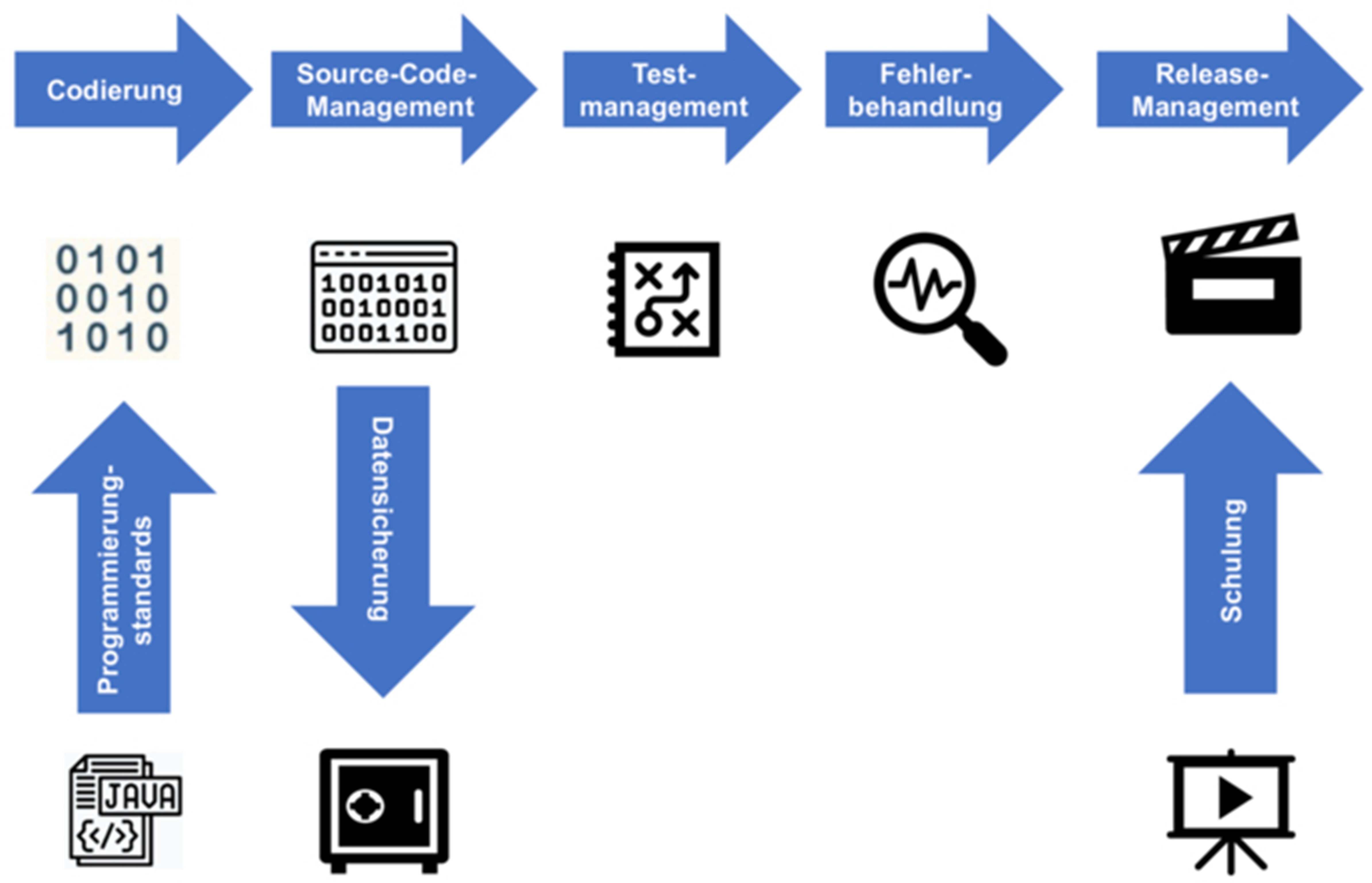 - Datensicherung: Der Source-Code muss entsprechend gesichert werden, sowohl während der Entwicklung als auch während des operativen Betriebs.