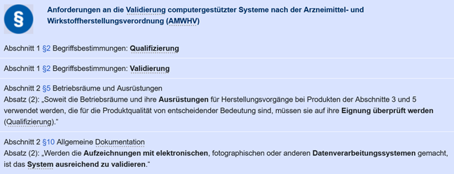 Für die Validierung computergestützter Systeme sind folgende Paragrafen von Bedeutung: