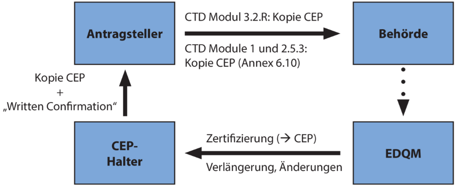 Im Zulassungsverfahren für ein Arzneimittel fragt der Antragsteller dann den Halter des CEP (also seinen Wirkstofflieferanten) an, ob er auf das CEP Bezug nehmen darf. Daraufhin stellt der Wirkstoffhersteller eine sogenannte „Written Confirmation“ aus, in der er versichert, den Antragssteller nach Erteilen der Zulassung über alle Änderungen zu informieren. Diese „Written Confirmation“ und das eigentliche CEP werden mit dem Zulassungsdossier eingereicht (siehe Abbildung 1).