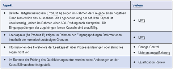 - Beschreibung: Für die Produkte A und B (gleicher Wirkstoff, andere Dosierung) wird ein gemeinsamer PQR erstellt. Hier zeigt die Bewertung der Trendanalysen zu Produkt A ein erhöhtes Risikopotenzial für zukünftige Fertigungen durch fehlerhafte Logobedruckung der befüllten Kapseln. Änderungen am Herstellungsprozess für Produkt A liegen nicht vor. Die zur Befüllung der Leerkapseln A1 verwendete Anlage ist intakt und ordnungsgemäß qualifiziert.