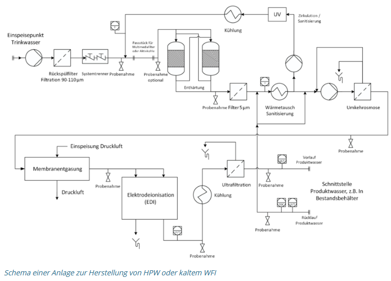 Der Aufbau einer Anlage zur Herstellung von HPW-Wasser oder kaltem WFI ist in folgender Abbildung dargestellt.