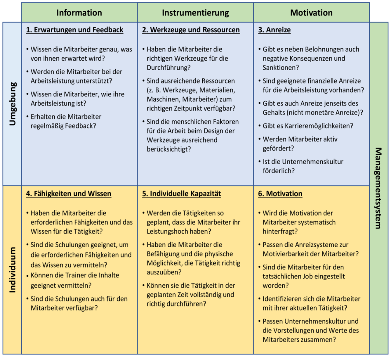 Es gibt einige allgemeine Modelle, die bei der Bewertung und Verbesserung von „human error“ herangezogen werden können,z. B. das in Abbildung 3 gezeigte Gilbert-Modell für Verhaltensmodellierung (Gilbert’s Behavioral Engineering Model).