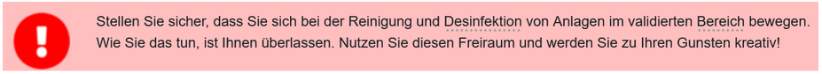 Reinigungs- und Desinfektionsverfahren müssen wirksam sein. Dazu werden geeignete Materialien ausgewählt und die Verfahren validiert. Die Reinigung und Desinfektion dürfen selbst keine Kontaminationsquelle darstellen.