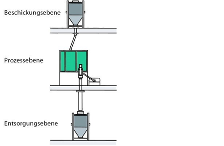Beim vertikalen Materialfluss, der erstmals von Prof. Lhoest realisiert wurde, wird für den Produkttransport gezielt die Schwerkraft eingesetzt. Die Produktionsanlagen sind über mehrere Ebenen miteinander verbunden. Transport- und Produktionsprozesse finden auf unterschiedlichen Ebenen statt, die über entsprechende Transportsysteme, meistens Rohre, Schneckenförderer usw. miteinander verbunden sind (siehe Abbildung 2). Der vertikale Materialfluss wird hauptsächlich in Feststoffbetrieben eingesetzt. So wird beispielsweise ein Container mit Granulat oberhalb einer Tablettenpresse positioniert. Das Granulat wird unter Nutzung der Schwerkraft über geeignete Zuführungen direkt in die Tablettenpresse geleitet. Die fertigen Tabletten werden wiederum unter Nutzung der Schwerkraft in einen unterhalb der Tablettenpresse befindlichen Container geführt. Durch dieses Materialflussprinzip werden Transportwege von der Produktionsebene (hier die Tablettierung) getrennt. Damit verringert sich der Platzbedarf im eigentlichen Produktionsbereich und das Risiko von Verwechslungen und (Kreuz)-Kontaminationen wird reduziert. Ein wirtschaftlicher Vorteil dieses Konzeptes liegt darin, dass der Platzbedarf für die Prozessschritte mit den höchsten GMP-Anforderungen minimiert werden kann, da die Transportvorgänge in geschlossenen Containern in einer Umgebung mit niedrigeren Reinheitsanforderungen erfolgen können. Diesen Vorteilen stehen allerdings der hohe Automatisierungsgrad und der damit verbundene Validierungsaufwand gegenüber. Auch die Reinigung der Verbindungen kann in der Praxis Probleme bereiten.