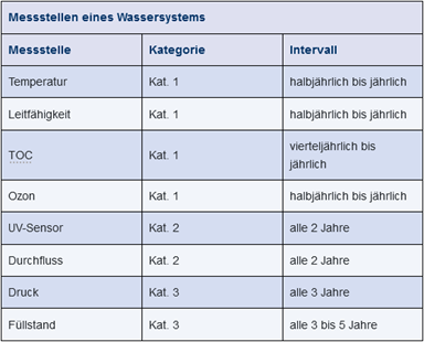 Eine Übersicht über alle Messeinrichtungen, unabhängig von der Kategorie, muss vorhanden sein. Dies ist ein wesentlicher Punkt innerhalb einer Inspektion. Die Kalibrierungen der Messstellen müssen in das Wartungssystem aufgenommen werden und dort nach dem gleichen Vorgehen wie ein Wartungsvorgang bearbeitet und dokumentiert werden. Abbildung 2 zeigt die Zuordnung relevanter Messstellen eines Wassersystems zu den vorgenannten Kategorien unter gleichzeitiger Angabe der Kalibrierintervalle.