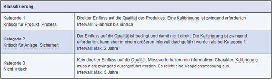 Abbildung 1 zeigt eine mögliche Klassifizierung und Festlegung von Kalibrierintervallen auf Basis dieser Aspekte.
