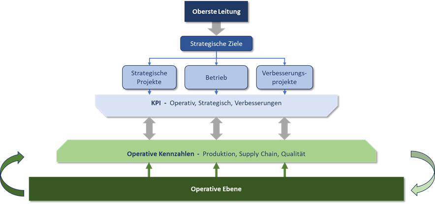 Bei der Festlegung dieser Kennzahlen sollten die Steuerungs- und Überwachungsbedürfnisse der obersten Leitung, z. B. Geschäftsleitung, und der operativen Bereiche berücksichtigt werden. Für die oberste Leitung sind die strategischen Ziele und zugehörigen Verbesserungsprojekte sowie der operative Betrieb inkl. PQS von primärer Bedeutung. Dazu werden Qualitätskennzahlen (Key Performance Indicators) festgelegt. Diese setzen sich idealerweise fort in den Kennzahlen der operativen Bereiche. Ohne diese Synchronisation liegt keine sinnvolle Verknüpfung zwischen operativen und strategischen Zielen vor (Abbildung 1).