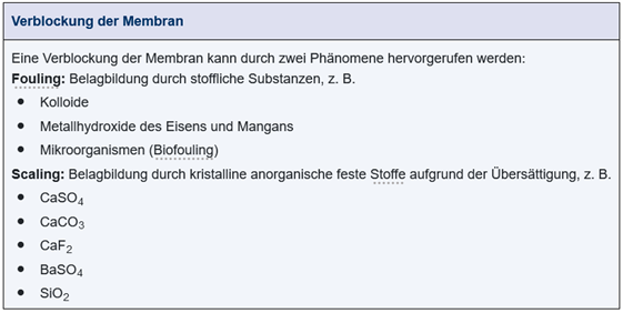 Im Prinzip stellt die Konditionierung ein Verfahren dar, welches die Schadstoffe entfernt bzw. während des Membranprozesses in Lösung hält oder zumindest stabilisiert, um somit Schaden auf der Membranoberfläche zu verhindern. Dabei lassen sich zwei grundsätzliche Probleme unterscheiden: