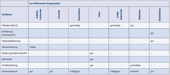 Abbildung 5.B-10 gibt einen Überblick über die Einsatzmöglichkeiten und Wirkungsspektren der unterschiedlichen Konditionierungsverfahren. Die Verfahren werden im Folgenden vorgestellt. Häufig werden auch verschiedene Verfahren kombiniert, z. B. Filtration und Enthärtung.