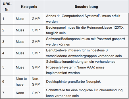 Die versteckten Anforderungen in der Projektbeschreibung sind kategorisierbar. Es gibt „Muss“-, „Kann“- und „Nice-to-have“-Anforderungskategorien. Ebenso wäre es möglich, zusätzlich in GMP-Anforderungen und Nicht-GMP-Anforderungen zu kategorisieren.