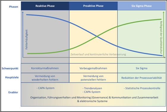 In die Zukunft gerichtet sind die Vorbeugemaßnahmen, die in dieser Phase im Vordergrund stehen und für eine fortlaufend weitere Fehlerreduktion sorgen. Diese Phase spiegelt einen verbesserten Reifegrad der Qualitätskultur wider.