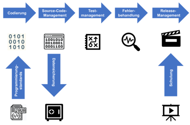 - Datensicherung: Der Source-Code muss entsprechend gesichert werden, sowohl während der Entwicklung als auch während des operativen Betriebs.