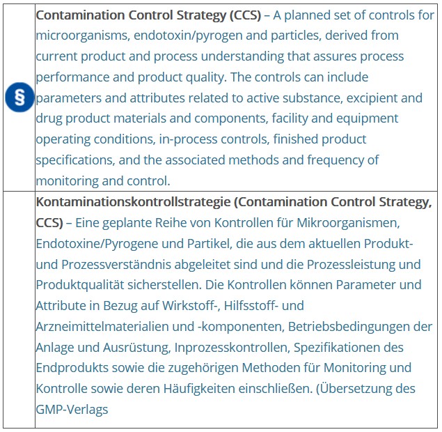 In Abbildung 1 finden Sie die Definition der Kontaminationskontrollstrategie aus dem Glossar zum Annex 1.