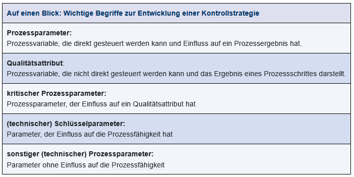 Produktionsprozesse müssen kontrolliert ablaufen. Um dies zu erreichen, muss während der pharmazeutischen Entwicklung beziehungsweise während eines Technologietransfers eine wirksame Kontrollstrategie entwickelt werden. Dazu müssen die Prozessvariablen bekannt sein.