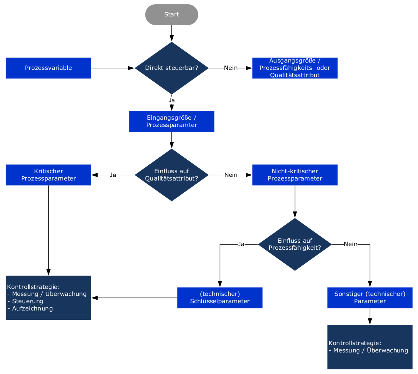 Diese können mit Hilfe von Prozessfließbildern identifiziert werden. Dann wird ermittelt, ob eine Prozessvariable als Prozessparameter oder Produkt-Qualitätsattribut angesehen werden muss: