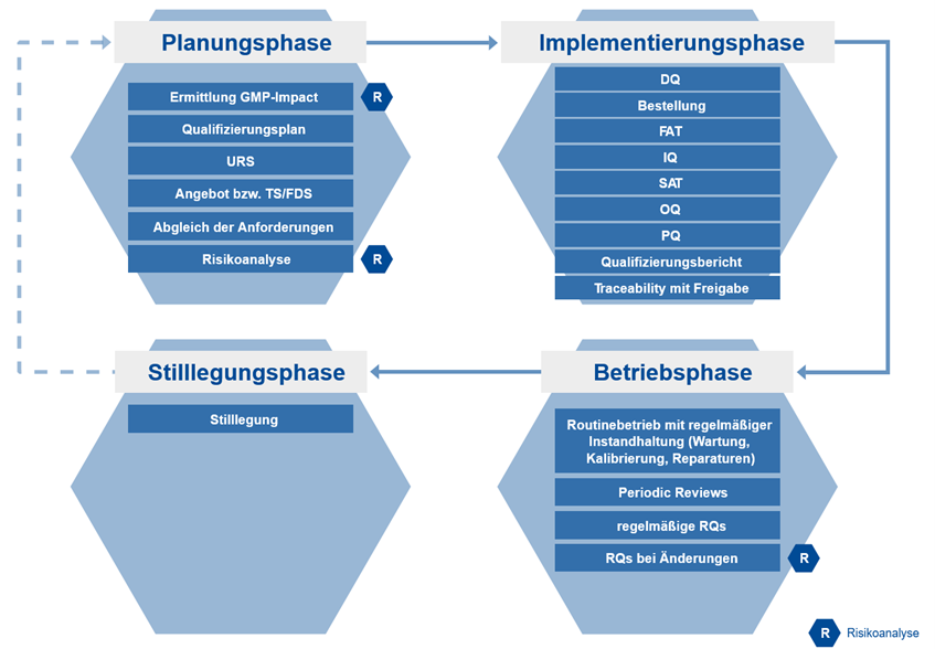 Bei einer neuen Anlage beginnt der Lebenszyklus bei der Planungsphase. Dort geht es darum, den GMP-Impact mit Hilfe einer Risikoanalyse zu ermitteln, den Qualifizierungsplan und das Lastenheft bzw. die URS zu erstellen, eventuell eine CSV-Systembeschreibung zu erstellen, das Angebot bzw. das Pflichtenheft (TS/FDS) einzuholen und mit den Anforderungen abzugleichen und schließlich wieder eine Risikoanalyse zu erstellen. Nach erfolgreichem Abschluss der Planungsphase, folgt die Implementierungsphase mit der Designqualifizierung (DQ), der Bestellung, dem Factory Acceptance Test (FAT), der Installationsqualifizierung (IQ), dem Site Acceptance Test (SAT), der Operational Qualification (OQ), der Performance Qualification (PQ), dem abschließenden Qualifizierungsbericht und der Tracebility-Matrix mit Freigabe. Anschließend folgt die Betriebsphase. Dort gibt es den Routinebetrieb mit regelmäßiger Instandhaltung (Wartung, Kalibrierung, Reparaturen), Periodic Reviews, regelmäßige Requalifizierungen bzw. Requalifizierungen bei Änderungen (inkl. Risikoanalyse) und sofern relevant: Überprüfung von Audittrail und Benutzerverwaltung im Rahmen der CSV. Wenn die Anlage außer Betrieb genommen werden soll, folgt schließlich die Stilllegung im Rahmen der Stilllegungsphase.