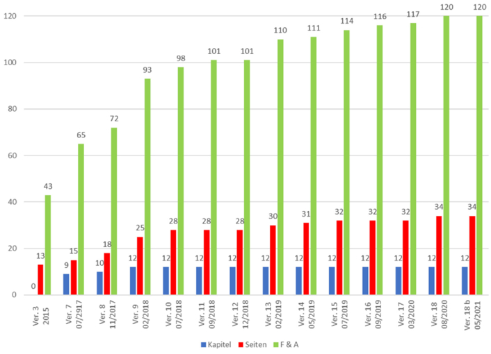 Die konkreten Festlegungen bezüglich der Ausgestaltung der Sicherheitsmerkmale, insbesondere der Kodierung, finden sich in der Delegierten Verordnung (EU) 2016/161der Kommission vom 2. Oktober 2015 zur Ergänzung der Richtlinie 2001/83/EG des Europäischen Parlaments und des Rates durch die Festlegung genauer Bestimmungen über die Sicherheitsmerkmale auf der Verpackung von Humanarzneimitteln (siehe Kapitel G.1.2). Diese Delegierte Verordnung ist direkt geltendes Recht in der EU. Aufgrund der Komplexität des Themas wurde zusätzlich ein Frage-Antwort-Dokument bereitgestellt mit dem Titel „Safety Features for Medicinal Product for Human Use – Questions and Answers“ (siehe Kapitel G.1.2.1). Die Veröffentlichung zahlreicher Versionen innerhalb kürzester Zeit und der dabei immer weiter zunehmende Inhalt (siehe Abbildung 21.I-8) zeigen, wie komplex die Materie ist. Einerseits, weil es regelmäßig eine Diskrepanz zwischen einem von Juristen formulierten Gesetzestext und dessen praktischer Interpretation und Umsetzung gibt. Andererseits wurden offensichtlich nicht alle relevanten Aspekte eindeutig genug geregelt, so dass diese Lücken nachträglich geschlossen werden müssen.