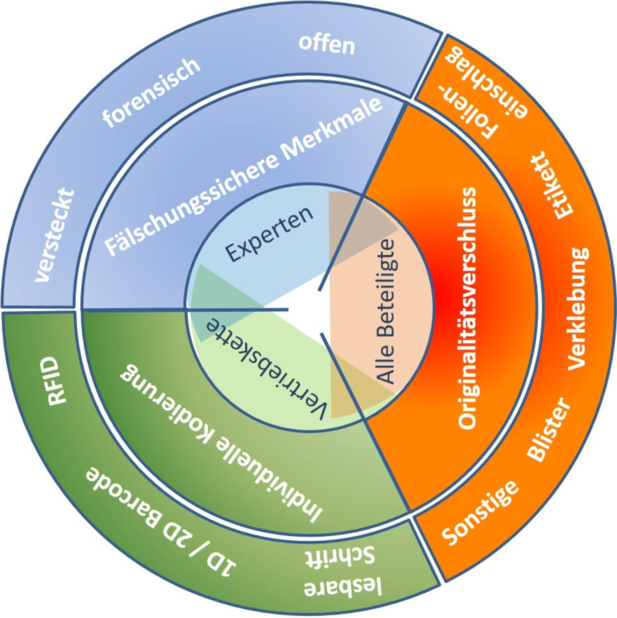 Fälschungssichere Merkmale können ebenso wie individuelle Kodierungen prinzipiell auf Sekundär- und Primärbehältnissen, bei bestimmten Arzneiformen auch auf dem Arzneimittel selbst eingesetzt werden. Originalitätsverschlüsse hingegen sind nur für Sekundär- und Primärbehältnisse üblich.