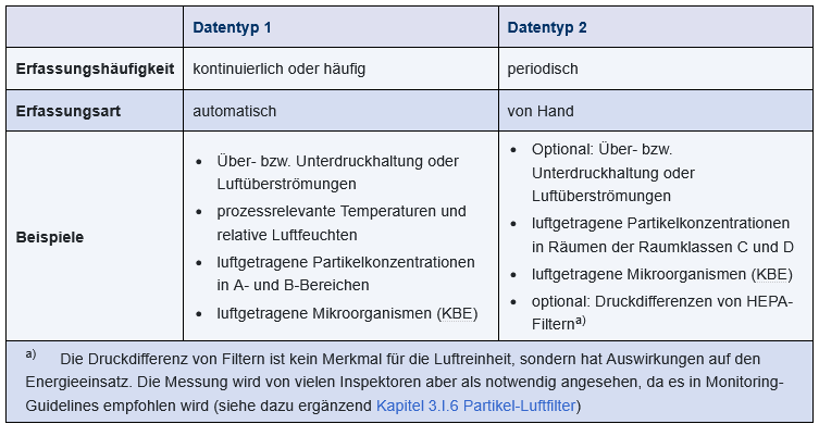 Nachstehend soll nur noch auf diejenigen Daten eingegangen werden, die im Rahmen des Pharmamonitorings der raumlufttechnischen Anlage zu belegen sind. Man muss dabei zwischen zwei Datentypen unterscheiden (siehe Abbildung 1).