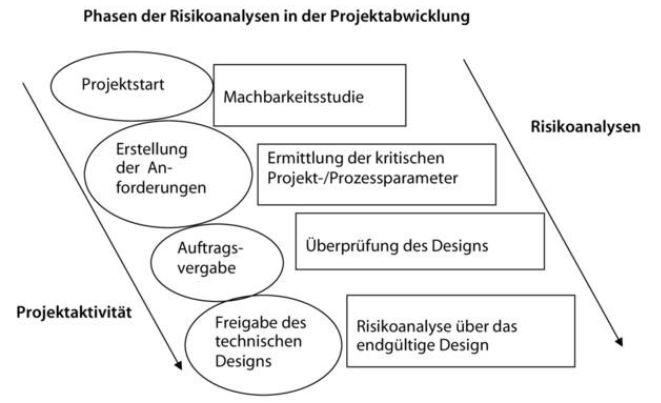Typischerweise beginnt ein Projekt mit einer Machbarkeitsstudie, die an sich schon eine Risikoanalyse darstellt. Im nächsten Schritt (Ermittlung kritischer Prozessparameter) sollte festgehalten werden, welches Risiko von der Ausrüstung für das Produkt ausgeht. Dies sollte im Rahmen der Zusammenstellung der Anforderungen erfolgen, um die Ermittlung der kritischen Prozessparameter (Critical Process Parameters/CPP) und der kritischen Qualitätsattribute (Critical Quality Attributes/CQA) zu unterstützen.