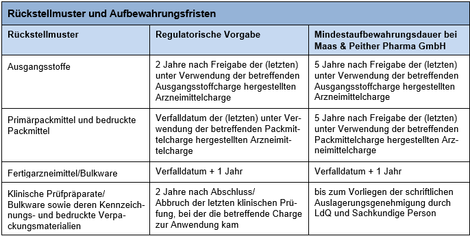 Natürlich kann die Aufbewahrung aller Rückstellmuster einfach entsprechend den regulatorischen Vorgaben erfolgen. Die bei Maas & Peither Pharma GmbH für Rückstellmuster von Ausgangsstoffen und Packmitteln definierten Vorgaben (siehe Tabelle oben) gehen teilweise über diese regulatorischen Anforderungen hinaus. Der Vorteil liegt darin, dass so die Rückstellmuster-Aufbewahrungsdauer vereinheitlicht und dadurch deren Überwachung vereinfacht wird.