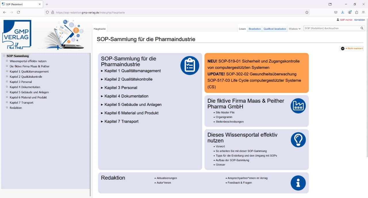 Die Startseite vermittelt einen Überblick über die einzelnen Bereiche der SOP-Sammlung. Neben den 7 Themengebieten finden Sie hier auch die Beschreibung der fiktiven Firma Maas&Peither Pharma GmbH, Informationen zu neuen und aktualisierten Inhalten sowie Tipps und Tricks zur Nutzung des Portals.