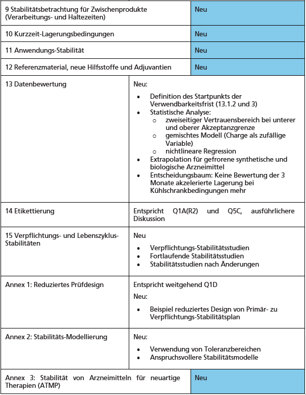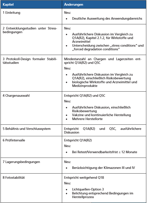 Tabelle 1: Übersicht der wesentlichen Änderungen in ICH Q1