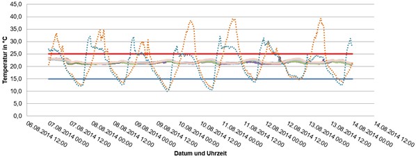 Je nach Ergebnis können sich diese Messstellen im Sommer von denen im Winter unterscheiden. Beispielsweise kann die Sonneneinstrahlung im Sommer den Logger an der festgelegten Position so beeinflussen, dass keine realistischen Messungen möglich sind. Weisen alle Messpunkte unkritische Schwankungen in der gleichen Größenordnung auf, so ist eine gleichmäßige Verteilung der Datenlogger für das Routinemonitoring zulässig.