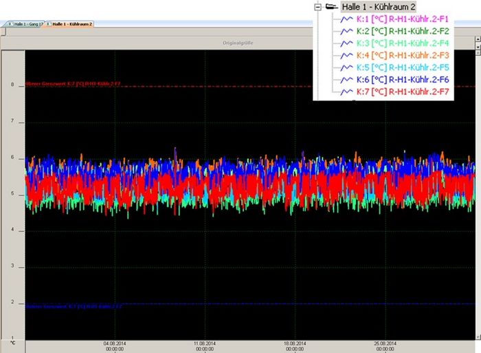 Abbildung 5 zeigt Temperaturmessungen von verschieden Datenloggern (unterschiedliche Farbe) eines Kühllagers. Der festgelegte Soll-Bereich liegt zwischen 2°C und 8°C.
