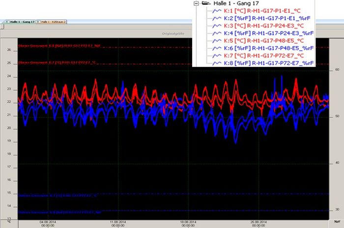 Abbildung 4 zeigt Messwerte von Temperatur- und Luftfeuchtigkeit von Datenloggern, die in unterschiedlichen Höhen eines Hochregals im Lagerbereich 15–25°C angebracht wurden. Die linke Ordinate gibt die Temperaturskala, die rechte Ordinate die Feuchteskala an. Messwerte zur Temperatur sind in rot und Messwerte für Feuchte sind in blau dargestellt. Grenzwerte sind mit 15 und 25°C sowie 30 und 65 %rel. Feuchte hinterlegt.