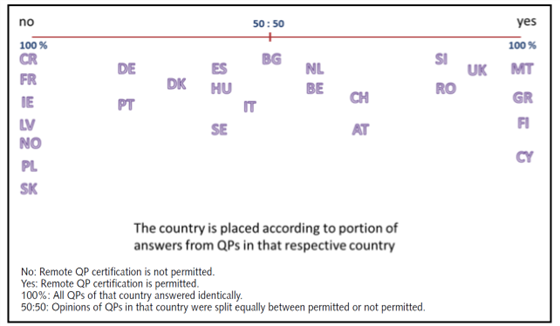 Die Umfrage, bei der mehr als 300 QPs geantwortet haben, ergab ein interessantes Muster von unterschiedlichen Ansätzen. Wie zu erwarten war, spiegelten die Antworten die angenommenen Erwartungen der jeweiligen nationalen Behörden und/oder das Verständnis des nationalen Rechts wider. QPs, die dort tätig sind, wo die “QP-Fernzertifizierung” allgemein akzeptiert ist, konnten die in der Umfrage gestellten Fragen deutlich besser beantworten als diejenigen, die glaubten, dass ihr nationales Recht dies nicht zulassen würde.