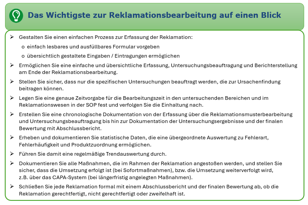 Reklamationen und Rückrufe müssen über die Einzelfalluntersuchung hinaus auch gesamtheitlich betrachtet werden. Berichterstellung und Festlegung von Maßnahmen, die am Ende wieder auf Effizienz überprüft werden, stellen dabei sicher, dass ein Arzneimittelunternehmen bei einer potenziellen Patientengefährdung sicher und schnell handeln kann. Aufgrund seiner Bedeutung für Arzneimittelqualität und Patientensicherheit ist das Reklamations- und Rückrufmanagement ein zentrales Thema bei Behördeninspektionen.