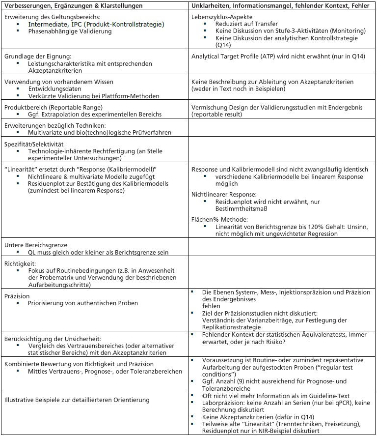 Seit den neunziger Jahren gab es wesentliche Weiterentwicklungen, insbesondere im Bereich der pharmazeutischen Produktion, wie beispielsweise die Quality-by-Design Werkzeuge, Risikoanalyse, oder Lebenszyklus. Die Validierungsguideline Q2(R1) fokussiert sich im Wesentlichen auf chromatographische Prüfverfahren, auf Grund des Fehlens von Akzeptanzkriterien ist die Basis der geforderten Eignung diffus und das Kapitel „Linearität“ verwirrt die Responsefunktion (Kalibriermodell) mit der Linearität des Analyten in der Probe, d. h. mit der Richtigkeit. Letzteres führte zu Problemen bei Analysetechniken mit nichtlinearen Responsefunktionen, insbesondere bei biologischen Methoden und Produkten.