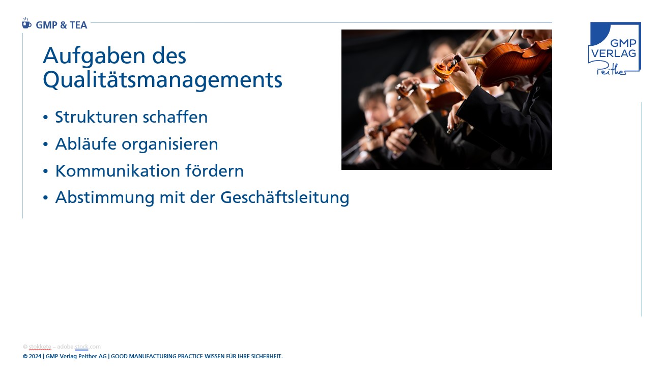Neben der Geschäftsleitung kommt dem Qualitätsmanagement eine entscheidende Rolle zu. So wie die erste Geige im Orchester den Ton angibt, sorgt das Qualitätsmanagement für Struktur, Organisation und Abstimmung der einzelnen Instrumente – Pardon: PQS-Elemente – untereinander.