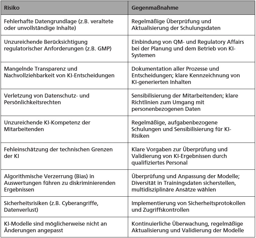 Die nachfolgende Tabelle enthält eine (nicht abschließende) Auflistung von Risiken und Gegenmaßnahmen, die beim Einsatz von KI-Systemen im Rahmen der GMP-Schulung zu beachten sind: