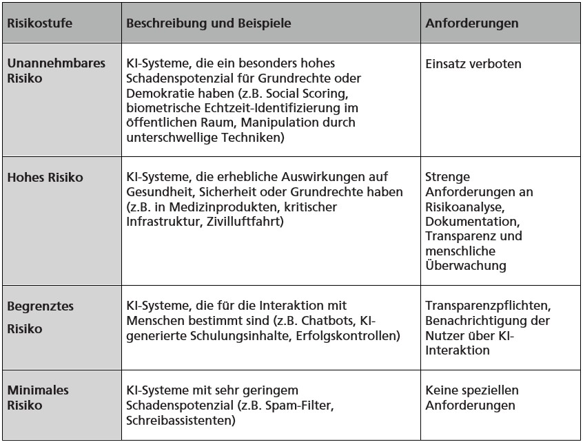 Vor dem Einsatz von KI-Systemen muss eine individuelle Risikobewertung durchgeführt werden. Wie bereits dargestellt, sind die Einsatzmöglichkeiten von KI bei der Durchführung von GMP-Schulungen sehr vielfältig. Dementsprechend kann hier keine pauschale Aussage über ihre Risikoeinstufung gemacht werden. Es ist die Pflicht des Herstellers, die von ihm eingesetzten KI-Systeme individuell zu analysieren und zu bewerten. Die Risikoklassifizierung von KI-Systemen erfolgt auf der Basis der Vorgaben der EU-KI-Verordnung. Danach werden KI-Systeme in verschiedene Risikostufen eingeteilt, denen jeweils unterschiedliche Anforderungen zugeordnet sind: