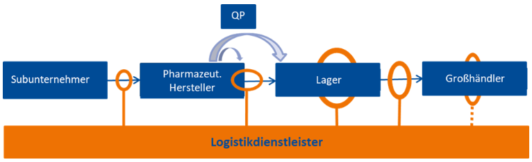Wo steht der Logistikdienstleister in der Supply Chain? – Ein Logistikdienstleister kann an unterschiedlichen Stellen in die pharmazeutische Lieferkette (Supply Chain) eingebunden sein. Die orangefarbenen Ringe in der nachstehenden Grafik zeigen dies.