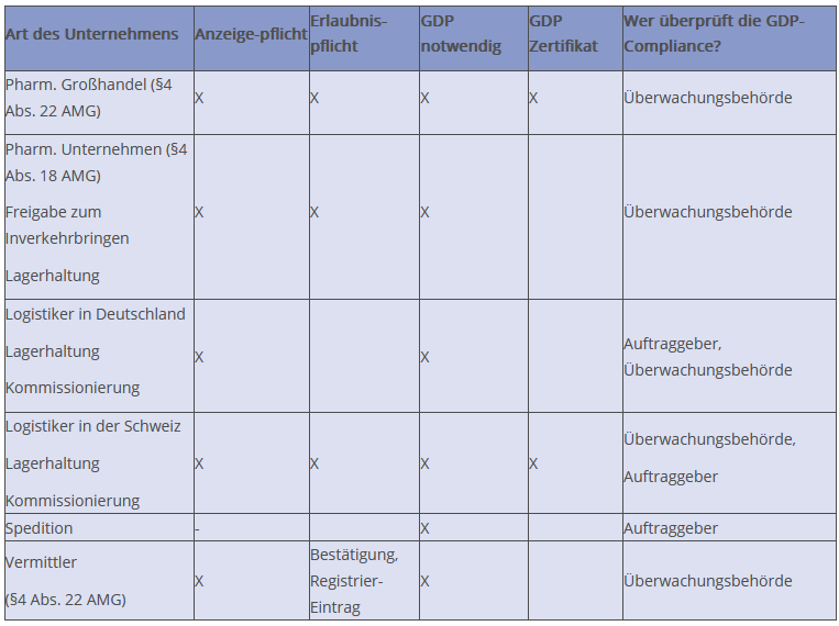 In der Schweiz werden laut AMBV (Arzneimittel-Bewilligungsverordnung) unter „Großhandel“ alle Tätigkeiten in Zusammenhang mit dem entgeltlichen oder unentgeltlichen Übertragen oder Überlassen von Arzneimitteln verstanden. Hier ist sichergestellt, dass auch GDP-kritische Tätigkeiten, die beispielsweise von einem Logistikunternehmen ausgeführt werden, von einer Betriebsbewilligung umfasst sind und somit der behördlichen Überwachung unterstehen.