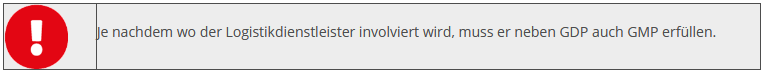 Die GDP-Leitlinien richten sich „nur“ an die Wirtschaftsakteure innerhalb der pharmazeutischen Vertriebskette. Ein Logistikdienstleister nimmt demnach nicht am Vertrieb teil und ist somit nicht gesetzlich verpflichtet, GDP einzuhalten.