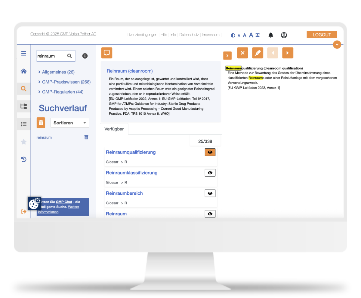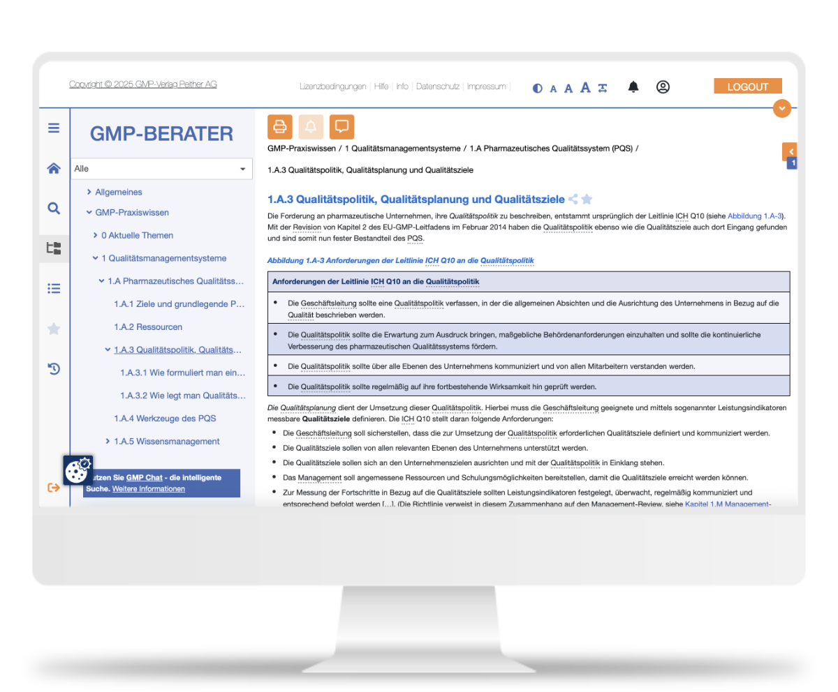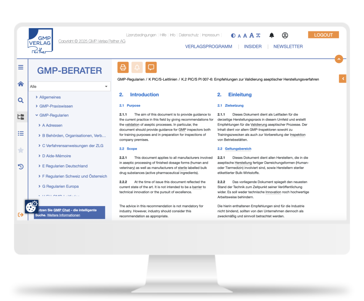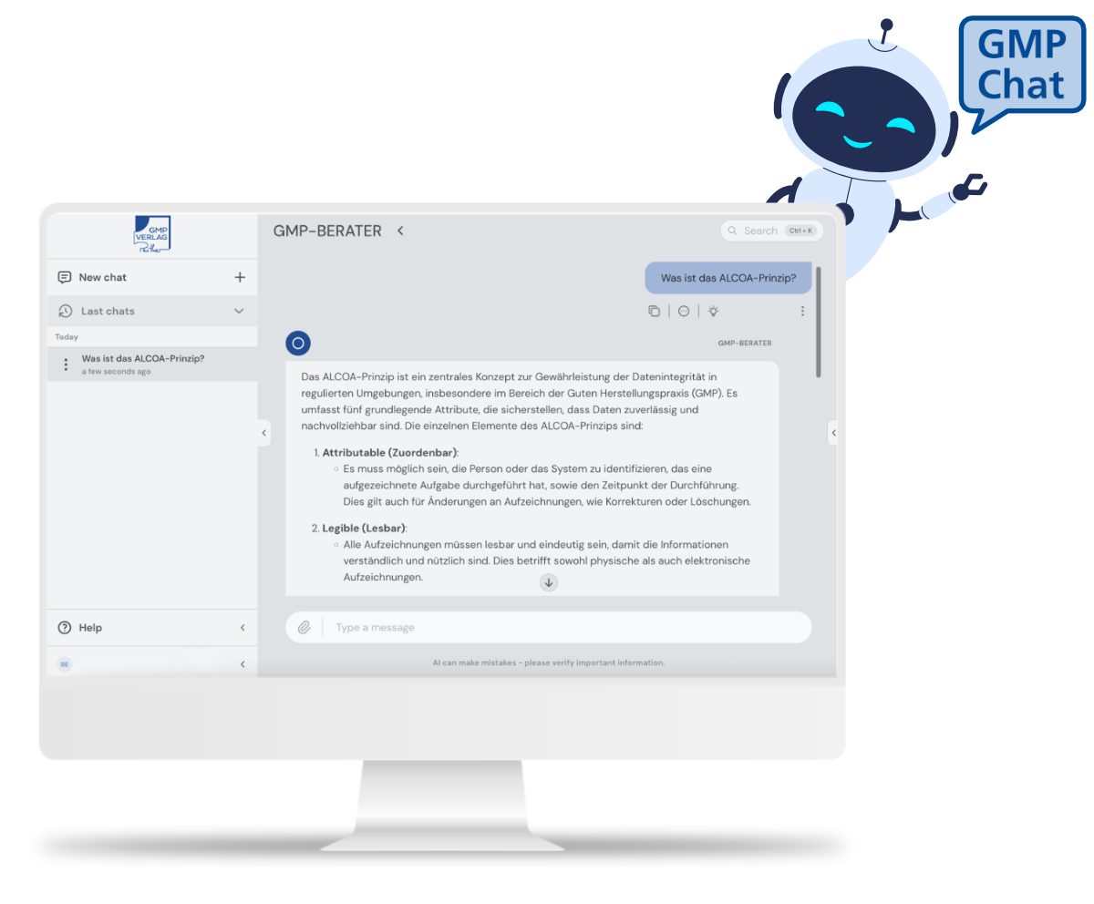 Die KI ist Teil des GMP-BERATERs und liefert schnelle und verlässliche Ergebnisse speziell zu Ihren GMP-Fragen. Einfach Frage eingeben und präzise Antwort erhalten – direkt aus der professionellen Datenbasis im GMP-BERATER.
