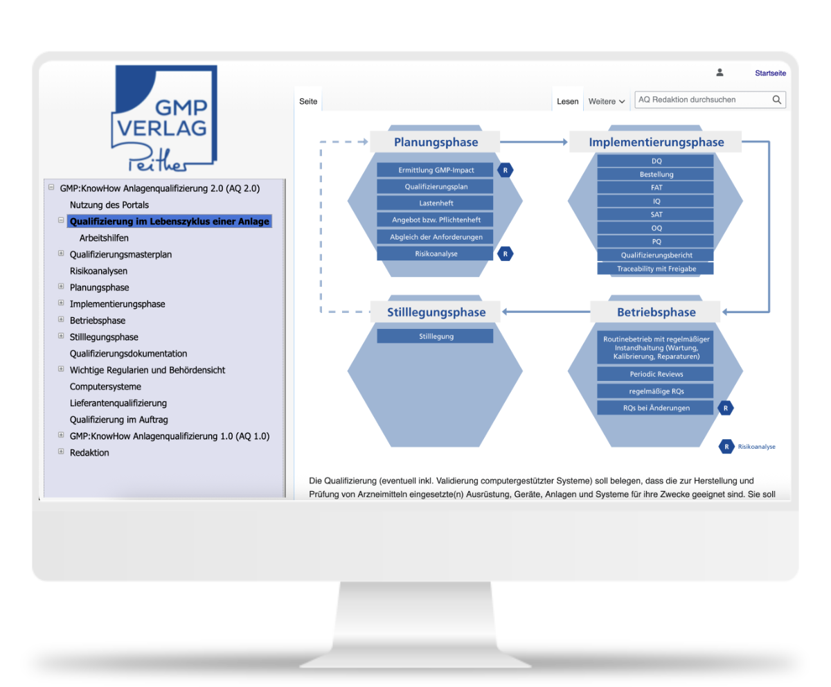 Das GMP:KnowHow Anlagenqualifizierung ist ein vom GMP-BERATER unabhängiges Produkt und konzentriert sich auf Inhalte, die für Anwender und Lieferanten von technischen Systemen wichtig sind. Hier finden Sie viele tiefergehende Inhalte, die im GMP-BERATER nicht enthalten sind.