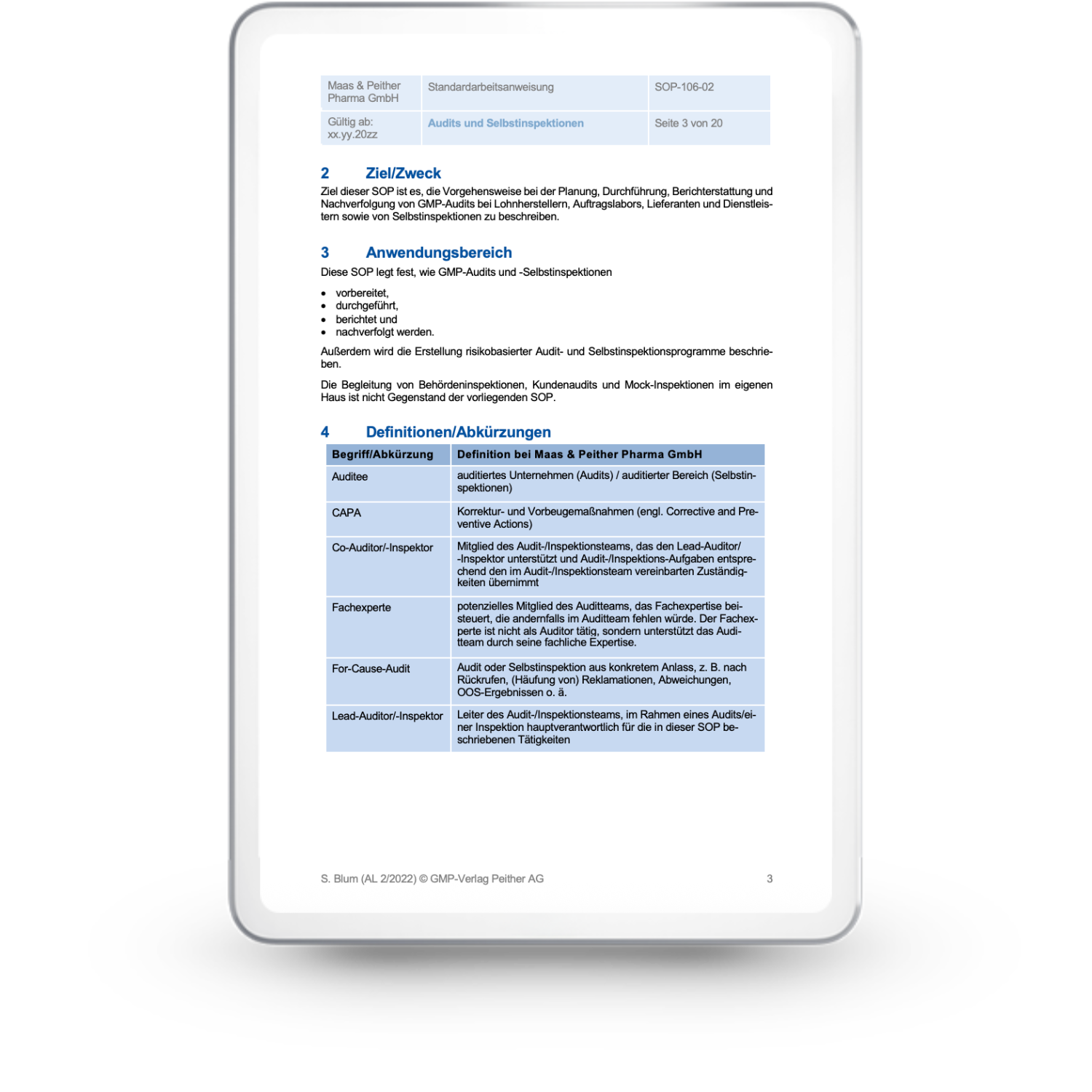 Diese Muster-SOP regelt die Vorgehensweise bei Selbstinspektionen und GMP-Audits von Lohnherstellern, Auftragslabors, Lieferanten und Dienstleistern.