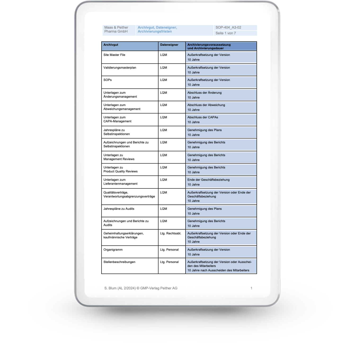 • GMP-relevante Dokumente und Aufzeichnungen und ihre Archivierungsfristen