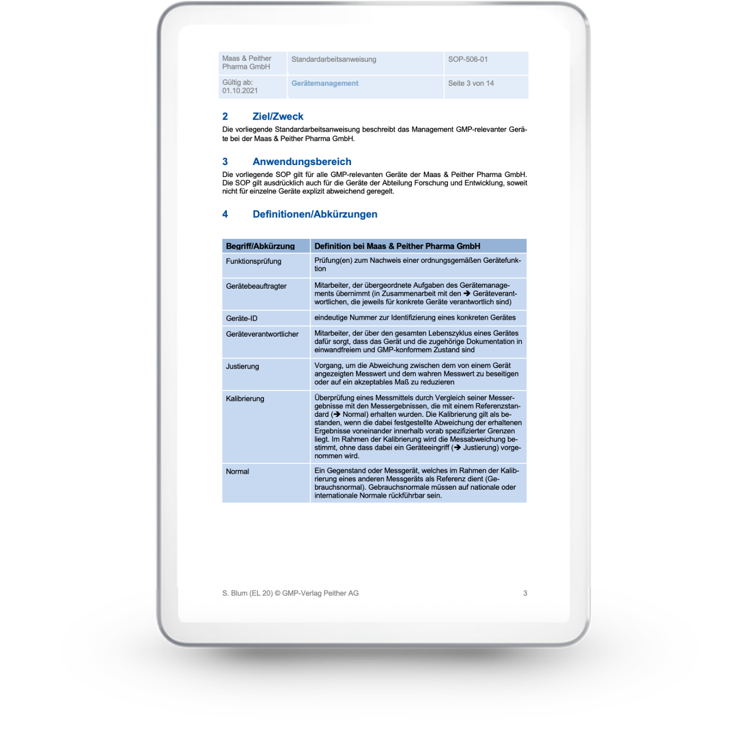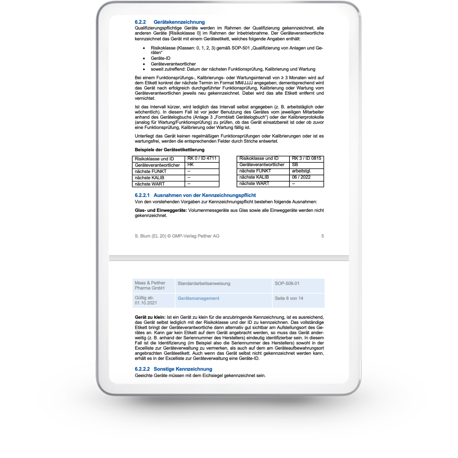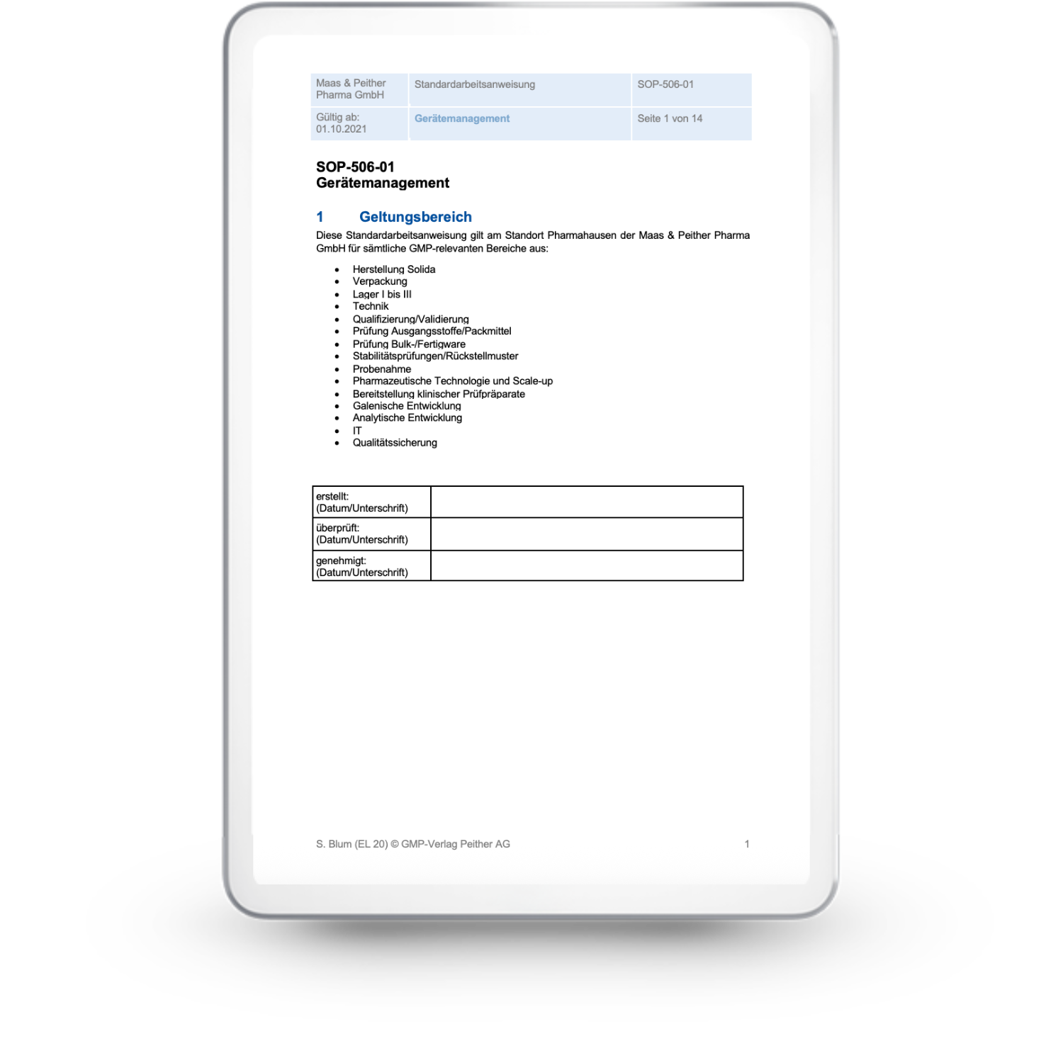 Definieren Sie diese und weitere relevante Punkte mithilfe dieser Muster-SOP. Beschreiben Sie das Management Ihrer GMP-relevanten Geräte.